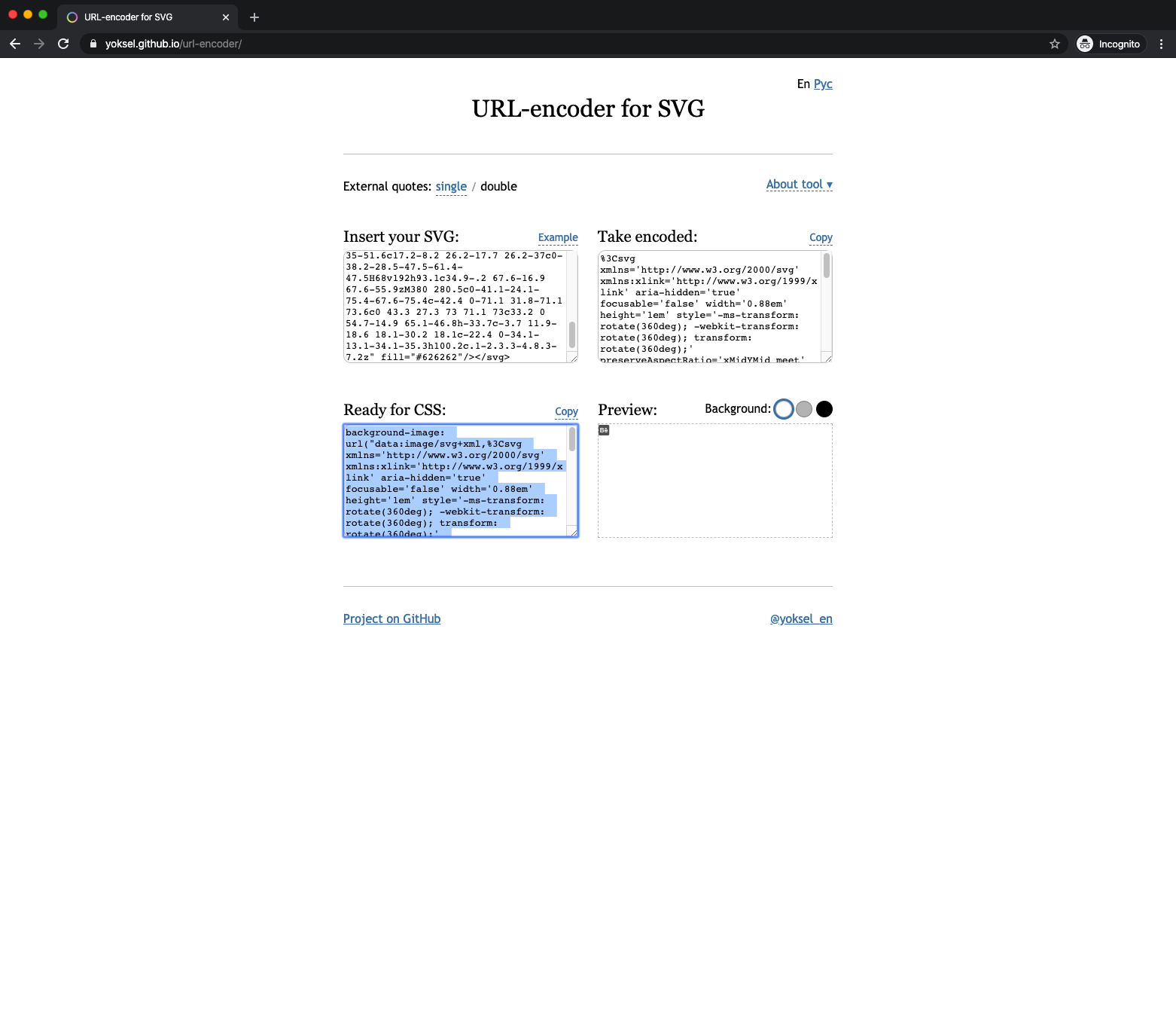 4. Go the URL Encoder for SVG site, paste the SVG content, and then copy the Ready for CSS content.