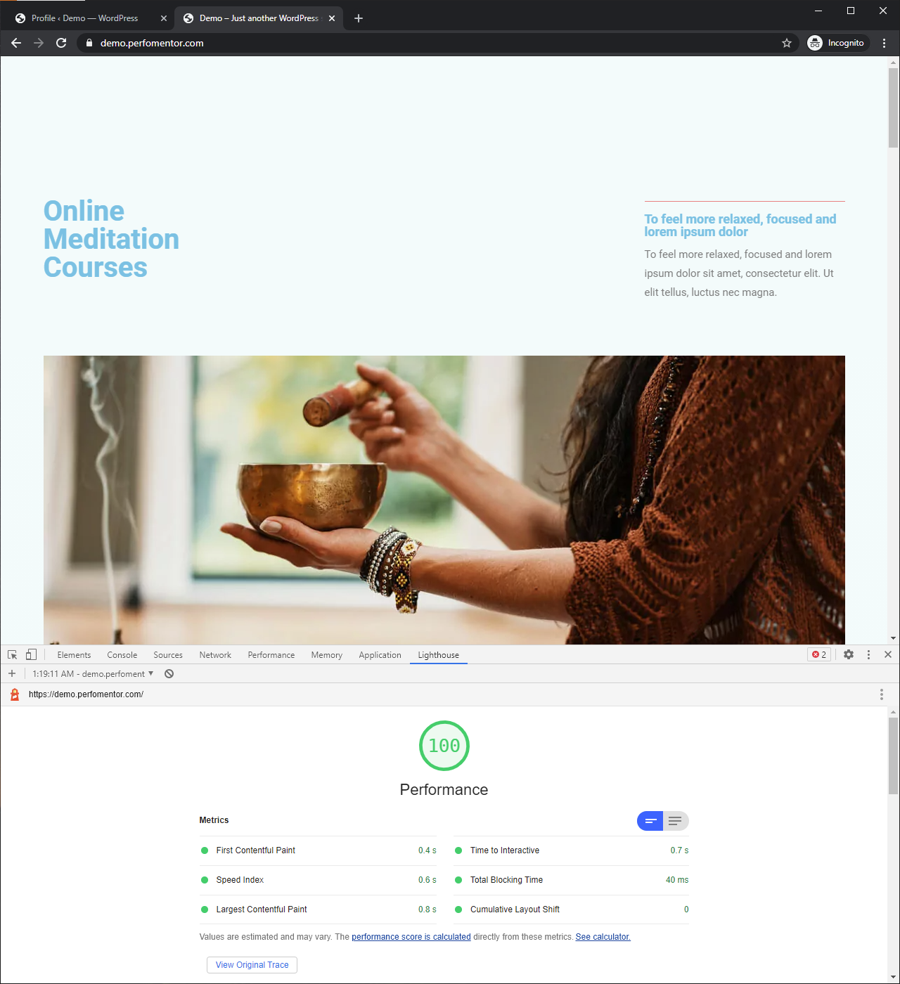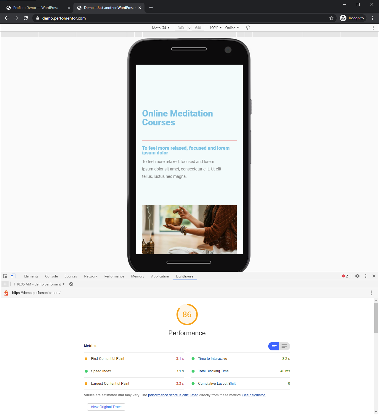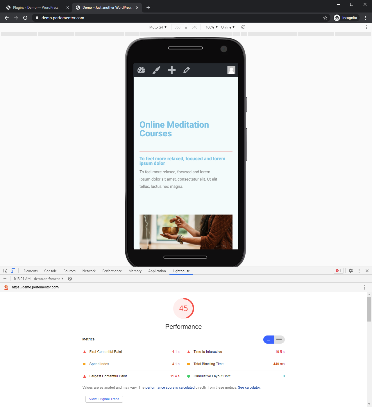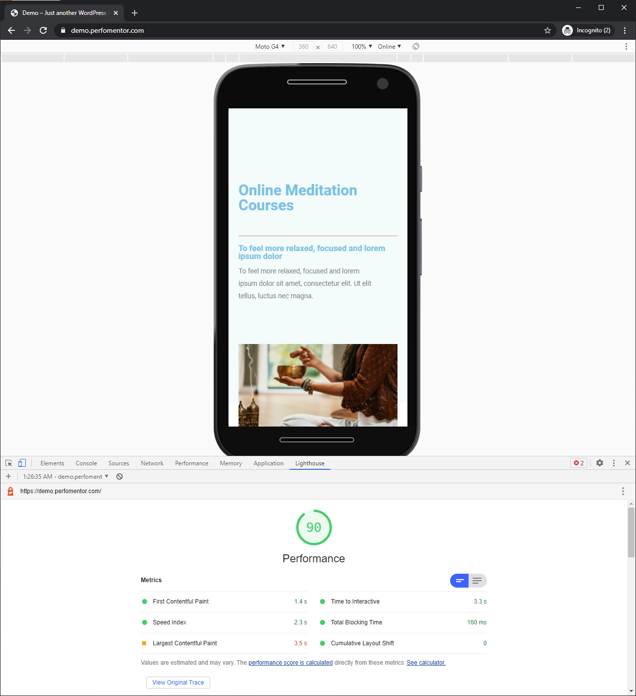 - Test our performance with Google Lighthouse (same as Google PageSpeed Insights) and get base scores around 45 for mobile and 87 for desktop with quite a bit of improvement required.
