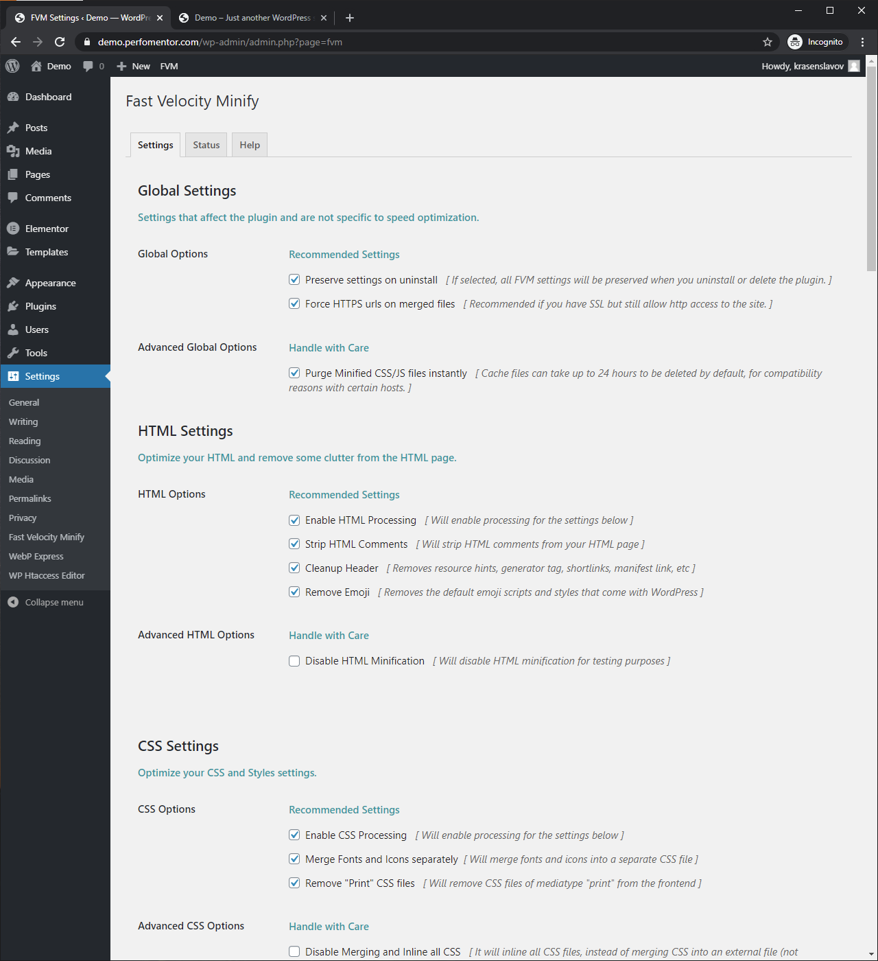 - Install and configure Fast Velocity Minify with the following options: