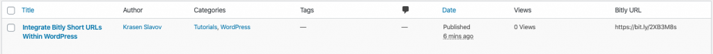 In addition, you may want to access and view the Bitly short URLs within your WordPress admin area. To do this, you need to extend your Post columns (you can apply the same for Pages or custom Posts) by adding a couple of actions with manage_posts_*.